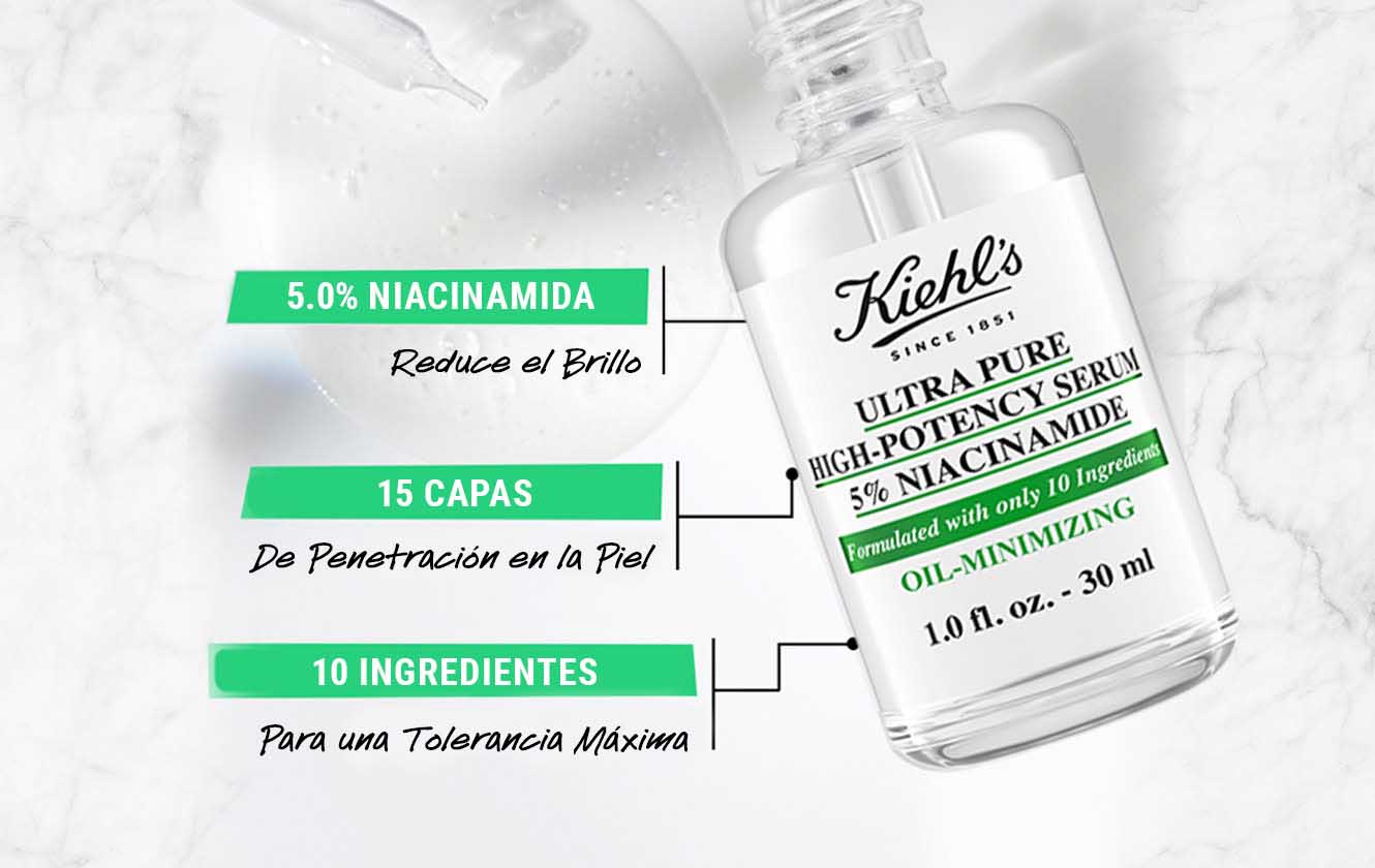 Kiehl's Suero Ultra Pure High-Potency 5.0% Niacinamide; Descubre la solución para reducir el brillo en tu piel con nuestro NUEVO Suero con 5.0% de Niacinamida, un nuevo miembro de tu rutina que verdaderamente funciona, reduciendo el exceso de brillo en la piel grasa por medio de su fórmula ultra precisa, pura y efectiva.